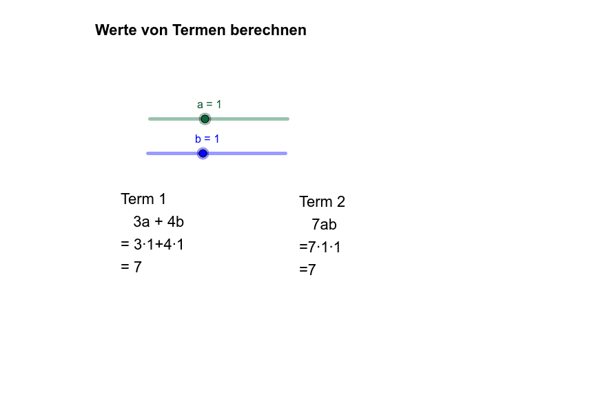 Im nachfolgenden Applet kannst du die Werte für a und b mithilfe der Schieberegler verändern. Beschreibe, wie jeweils die Werte der beiden Terme berechnet werden.
