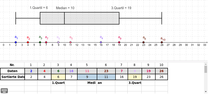 {{Box|Daten auswerten mit GeoGebra - Boxplot|Betrachte das GeoGebra-Applet von Andreas Lindner. Hier werden 10 Daten a<sub>1</sub> bis a<sub>10</sub> erhoben. Deren Wert kannst du durch verschieben der Punkte einstellen. <br>Die Rangliste wird in der Tabelle unter dem Boxplot erstellt, die Kennwerte unteres Quartil, Median (Zentralwert) und oberes Quartil, sind in der Tabelle markiert. <br>Der Boxplot wird passend dazu gezeichnet. Experimentiere mit dem Applet.|Üben}} | |||