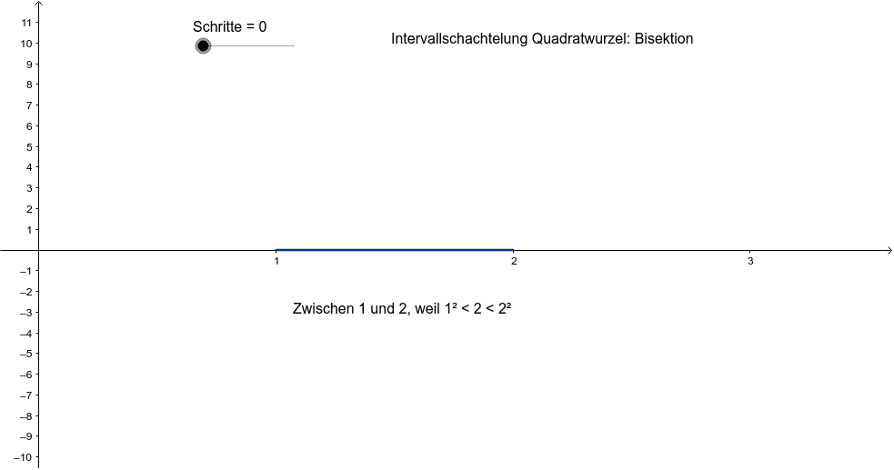 Dieses Intervall kannst du verkleinern, um den Wert von  auf mehrere Nachkommastellen anzunähern. Das nachfolgende Applet verdeutlicht dieses Vorgehen, die sogenannte Intervallschachtelung: